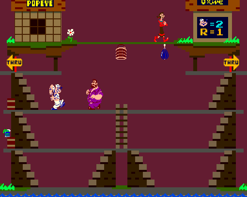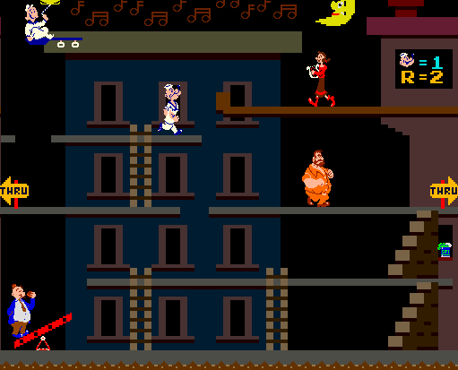 游戏数据很小,每一关卡仅有一画面,分为4层,层与层之间一般有楼梯相连。主角一边躲避天敌Bluto的攻击,