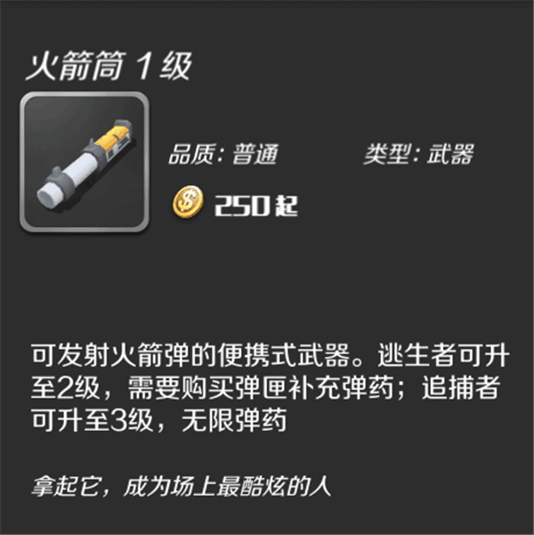 效果:可发射大颗导弹的攻击性武器。逃生者可升至2级,需要购买弹夹补充子弹;追捕者可升至3级,无限子弹。