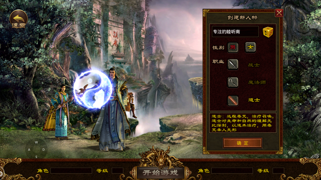 首先开始游戏前要选择一个适合自己的职业,一共有三种职业,法师,战士和道士。喜欢高攻击、操作比较厉害的玩家可以选择法师,法师升级比较快但是法师打的是运动战,不适合近身攻击。喜欢近战高爆发的就选择战士,战士体力和防御力非常强悍,但是魔抗比较低,适合新手玩家。偏向于辅助职业,喜欢辅助或者单挑的则可以选择道士职业。三种职业无强弱之分,都可选择。