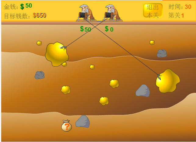 操作非常简单,键盘下键是右边的矿工放钩子,键盘上键是右边的矿工扔炸药
