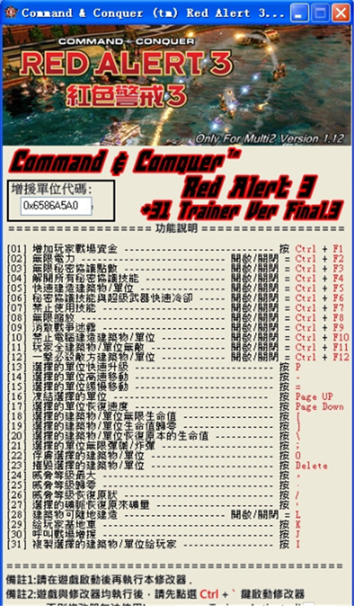 - 说 明:红色警戒3修改器Win10下载v1.12通用版