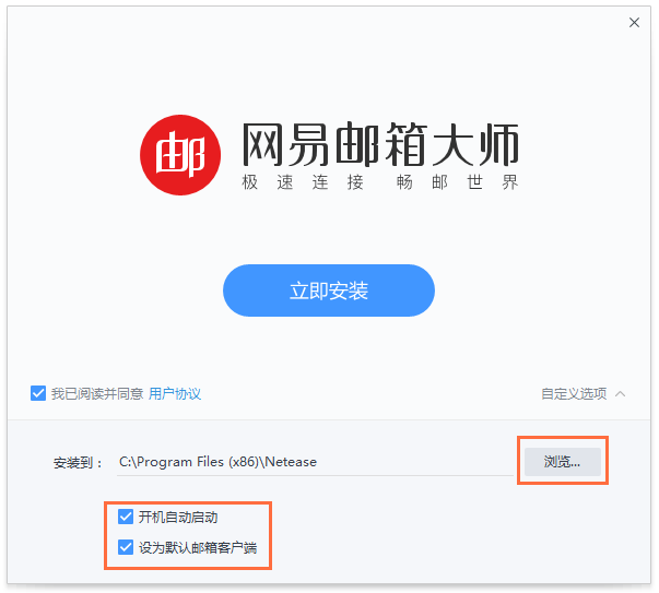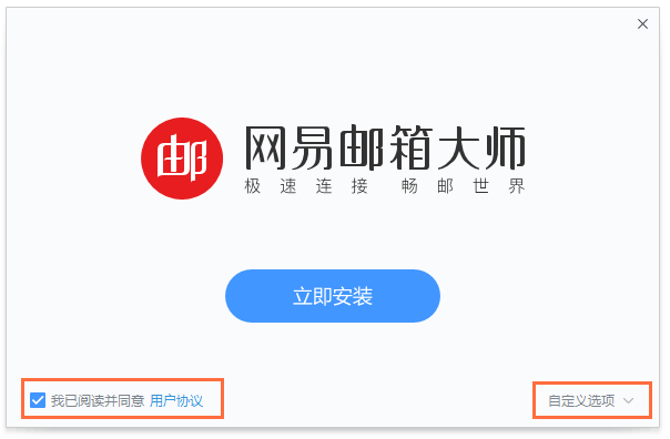 下载网易邮箱大师,解压压缩包,双击.exe文件,阅读协议并选择同意,点击【自定义选项】,网易邮箱大师,极速连接畅邮世界