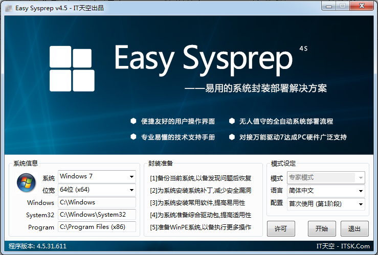 Easy Sysprep是IT天空打造的一款强大的系统封装工具,它与万能驱动助理结合后所得到的整套的系统部署解决方案,可以有效的将系统安装流程化繁为简,降低技术成本,是系统封装人员以及系统技术爱好者的必备系统封装工具。