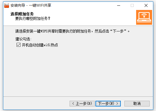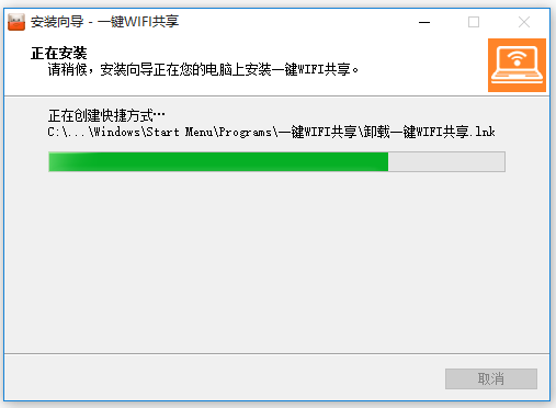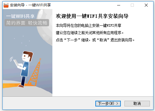 欢迎使用- -键WIFI共享安装向导本向导将在您的电脑上安装一键WIFI共享建议您在继续之前关闭其他所有应用程序。点击“下一步”继续,或“取消”退出安装向导。