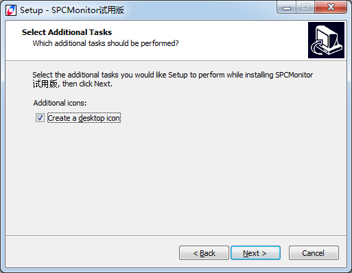 3.建议创建快捷方式;Select Additional Taskswhich additional tasks should be performed?select the additional tasks you would like Setup to perform while installing SPCMonitor试用版,then click Next.