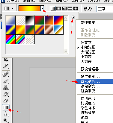 1、打开PS软件,打开渐变,然后如下图点击箭头,载入渐变。