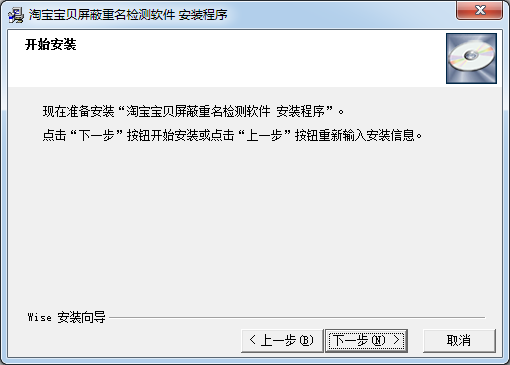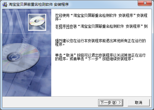 1.欢迎使用“淘宝宝贝屏蔽重名检测软件安装程序”安装程序。本程序将案装“淘宝宝贝屏蔽重名检测软件安装程序”到强烈建议您在运行本安装程序前退出其他所有正在运行的程序。单击“取消”按钮可以退出安装程序以关闭其他正在运行的程序,或者单击“下-步”按钮继续程序。