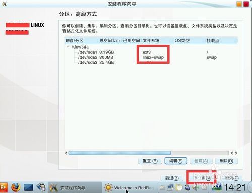 10:这里进行分区,一定要分一个ext3分区作为系统盘,一个linux-swap作为交换区,剩下的随便切记系统盘的挂载点是"/"(不包含引号)