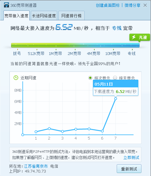 测试长途网络速度可测试到联通、移动和电信服务台的长途网速。
