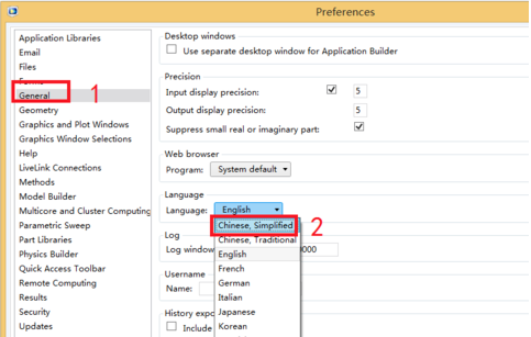 打开首选项后,将General(红框1)中的语言变成chinese(红框2)