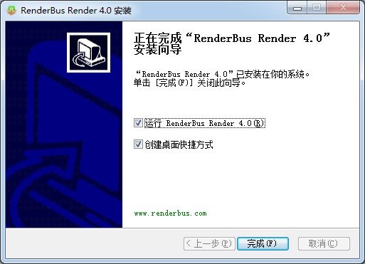 4.在完成“RenderBus Render 4.0”安装尚导RenderBus Render_4.0”已安装在你的系统。单击――完成F]关闭此向导。最后点击完成即可,软件安装完毕