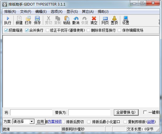 1.段式智能修正。将按字换行修改为按段落换行,自动删除空白段落,并根据需要选择单、双换行。2.排除干扰符(*)有些网站为了防止他人复制文章,故意使用了隐藏的无规律字符(乱码),本功能自动删除这些杂码,还你一篇干净整洁的文章。修改段落首尾的空白。3.删除段尾部的空白。段首补上两个全角空后,原本杂乱的文章会变得如此整齐。4.交换繁简的字体。论文从港台复制下来,全是繁体字,而企业网站要求用简体中文该怎么办?使用GIDOTTYPESETTER之后,不用到处找繁体字转换软件,排版和转换字体一次搞定!全角半角可以任意互换。转换全角标及英文字母为半角标,或转换半角标及英文字母为全角。6.修改标点。把多个连续句转化为省略号,把句点转换成句号,修正不对称引号。7.一键排字和复印。也就是,在排版选择了一键排版之后,GIDOTTYPESETTER是最小的,在复制文章之后按ALT+Q后软件自动对剪裁板上的文章进行排版。文稿即排版功能则完全取消了ALT+Q,在文章被复制到剪切板上的一瞬间,软件已将文章整理好,并将其保存在剪裁板上,按粘贴即可取出。
