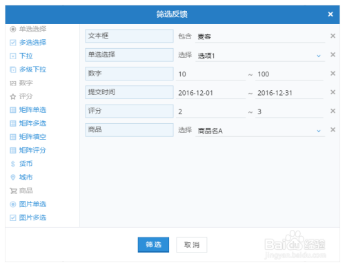 数据筛选:做问卷的时候,数据统计尤为重要。开启“结构化筛选”功能,可以根据问卷中包含的所有题目,选项,进行交叉式对比筛选。
