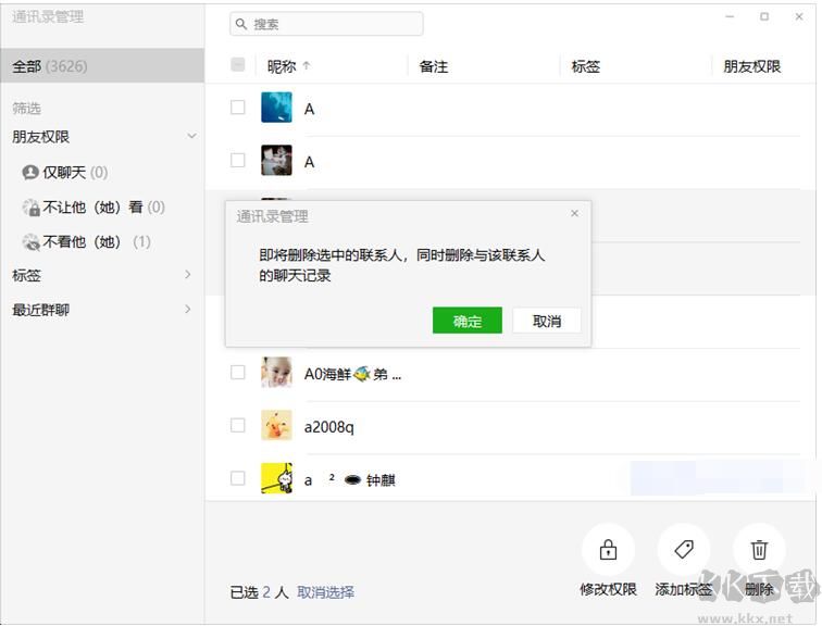 2、用户可以进行通讯录管理,比如还支持设置朋友权限,包括聊天、朋友圈、微信运动等,仅聊天。