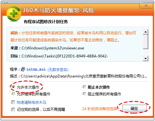 电脑安装的杀毒软件,或者防火墙,可能会提示您如下风险。此时需要允许程序进行安装。以360为例,点击允许本次操作,点击确定。否则会安装失败。