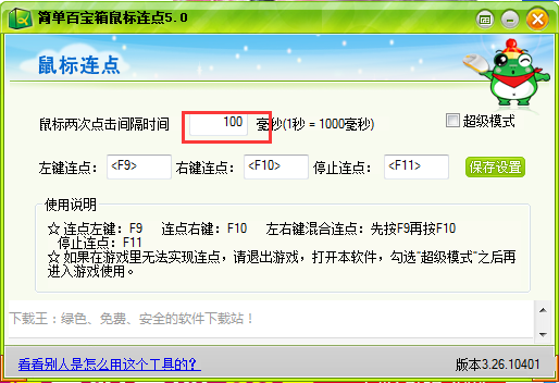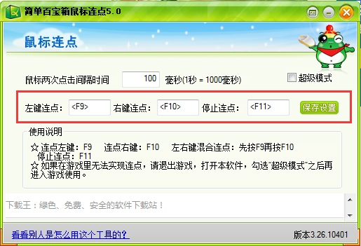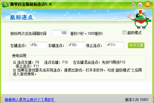 鼠标连点:支持鼠标左键右键每秒千次连点后台模式:支持鼠标后台连点超级模式:支持多种游戏的连点,尤其是网游鼠标锁定:支持鼠标固定某个位置进行连点点击次数:可随意设置你需要的点击次数简单百宝箱鼠标连点器快捷键