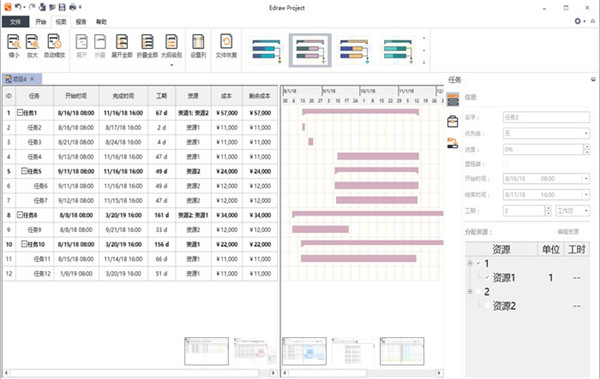 每个项目都涉及到相应的成本, Edraw Project这款软件将资源分为5类 :工时、材料、成本、设备和公司,方便对资源成本的设置。点击菜单栏上的“报告”,还可以查看资源成本的使用情况,以及项目进展情况,以便管理者能及时做出调整。