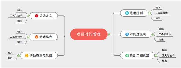 我们知道,项目时间管理是项目管理九大体系中的一块重要组成部分,它本质是一种对项目时间维度的管理方式,需要我们采取科学的手段进行运作。其管理方式主要分为6个阶段:活动定义、活动排序、活动资源包估算、活动工期估算、安排进度表、进度控制。通过下述思维导图,你会对此有更深入的了解。