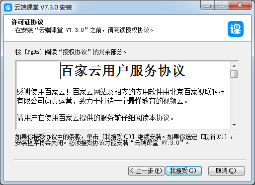 3.许可证协议在安装“云端课堂VT.3.0”之前,请阅读授权协议。点击我接受此协议,点击下一步