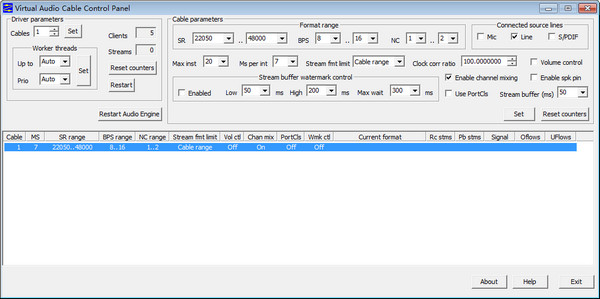 5、进行设置:将Wave in 设为 Line1(Virtual Audio Cable) ,Wave out 设为声音输出设备,如扬声器,然后可以单击Start了