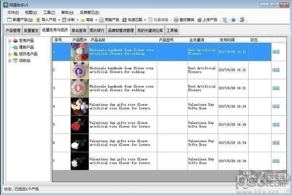 新建产品:能够单独在建一个产品,编辑进行后公布便是一个新产品;导进别人产品:把阿里首页检索出去的产品页网址输入就可以载入这一产品的內容和照片;提交产品:编辑进行后大批量提交编辑好的产品;迅速四项配对:将事前在产品名字,简略叙述,详细说明中设定的占位符全自动换成分别设定好的主关键词,完成关键词四项配对;在列表中显示信息产品照片:操纵产品列表中产品照片的显示信息和掩藏;选中:选中产品列表中全部产品;全选:选中产品列表中沒有选中的产品;复制产品:将当今选中的产品复制特定总数的团本;拷贝:将当今选中的产品拷贝到剪切板;裁切:将当今选中的产品裁切到剪切板;黏贴:将剪切板中的产品黏贴到当今选中的同组;删掉:将当今选中的产品从列表中删掉;大批量编辑产品:选中两个之上产品就激话大批量编辑莱单,子莱单中的项都能够大批量编辑;