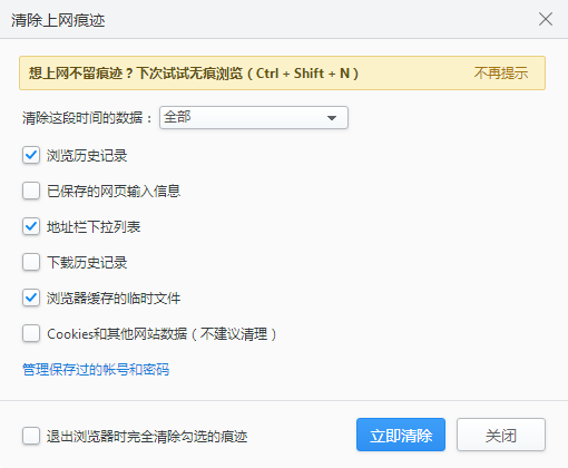 2、在清除上网痕迹界面,选择需要清理的内容,你也可以试试快捷键Ctrl+Shift+N