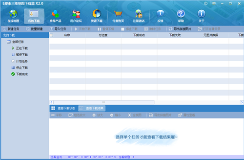 软件支持可视化新建任务,在主窗口中单击“在线地图浏览”标签切换到地图浏览窗口,单击工具栏上的“框选下载区域”按钮,在视图中绘出需要下载的范围选择框,然后在该选择框内双击鼠标即可开始新建任务。