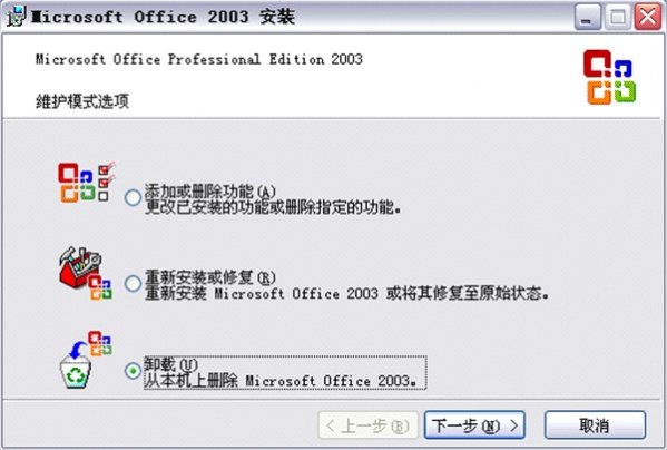 (10)如果要卸载Office 2003或者要重新安装Office 2003组件,可以再次运行安装光盘,计算机会自动调出“维护模式选项”对话框。