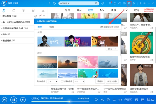 1、打开酷狗音乐客户端,点击页面右上角的【皮肤】按钮,弹出皮肤设置界面。