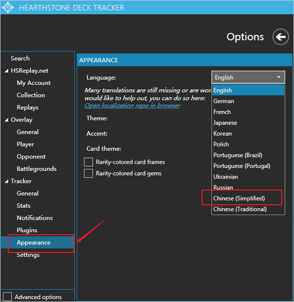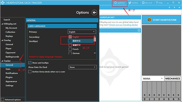 2、安装完成之后,会发现默认English语言,这时,点击"options"选项,找到tracker下的gengral选项,将记牌器的语言设置为"简体中文";