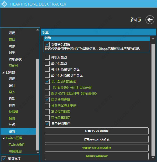 9、最后的总设置包括开机启动,启动最小化等等,比较有用的是设置炉石路径,设置炉石LOG路径等,可以解决大部分用不了的问题。