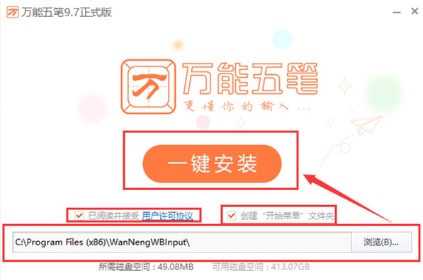 勾选【用户许可协议】和【创建“开始菜单”文件夹】后,单击【一键安装】安装软件