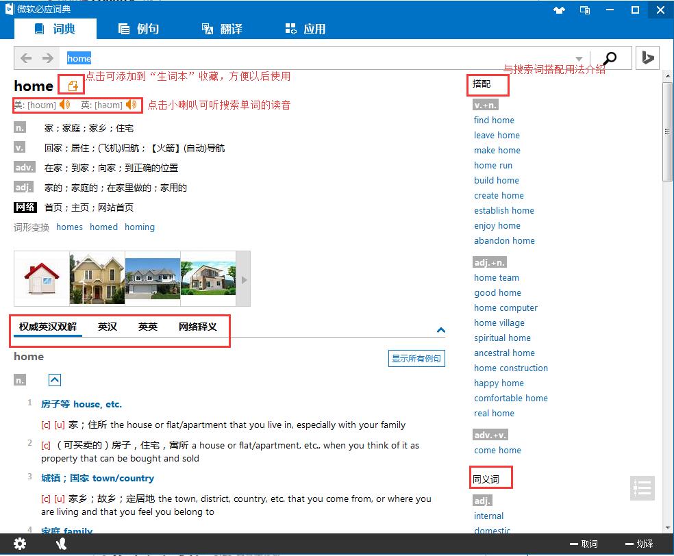 2、微软必应词典启动后我们可以看到每日一句、每日一词、每日阅读等推荐内容等,还有词典有四个选项:词典、例句、翻译、应用,默认选择在词典选项,可点击切换。