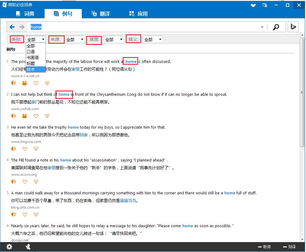 5、点击例句就可看到一系列搜索词相关展示,如中英对照、语音视频、用法匹配、海量例句,在这里大家还可以根据类别、来源、难度、释义等条件进行筛选例句。同时这里支持语性模糊匹配、通配符匹配对单词查询,如果有记不太清的单词可用此功能,一般常用的有“*”代表任意(0个或多个)字符 ,“?”任意1个字符等等。