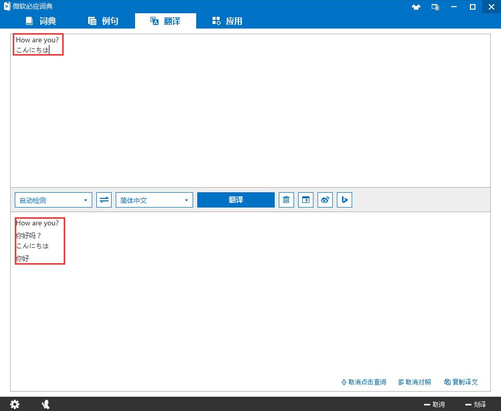 6、当然,必应词典还可以翻译整个句子或段落,这只需切换到“翻译”选项卡即可。在这里还可以自动检测输入的语言(如日语、英语)进行翻译,同时支持互译。在右下方还可以对查询方式、对照方式设置,同时还可以复制翻译的内容哦,对于翻译篇幅比较长的文章来说可以说这个功能非常实用了。