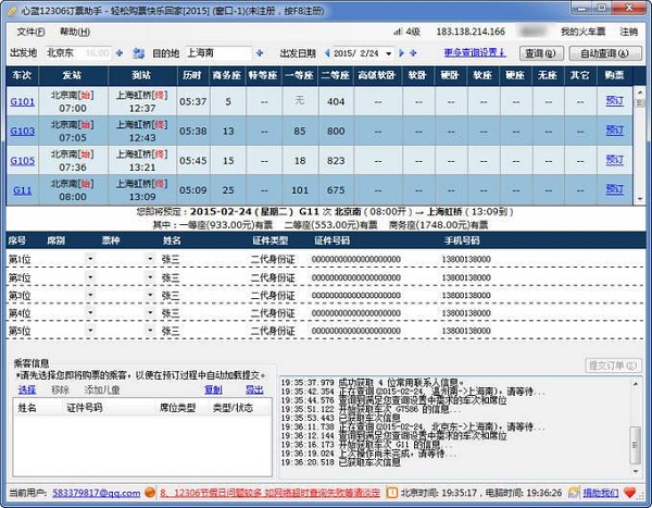 注:12306目前禁止同一个账号重复登陆,即只能开一个心蓝窗口购票,且不要再去网页或其它地方登陆。