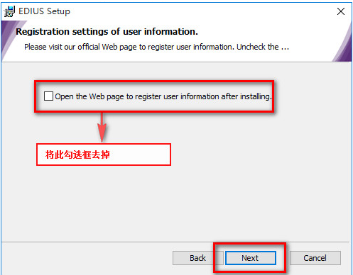 6、进入到EDIUS PRO8软件下图中的界面,跟上步骤一样将勾选的选项去掉之后点击界面下方的下一步。