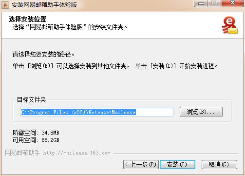 3、安装地址默认为“C:Program Files (x86)NeteaseMailease”,修改请点击“浏览”即可重新选择