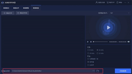 3、然后可以在右上方的“选择输出格式”下拉框中选择要转换的音频格式。最后在下面的设置参数上,可以选择质量参数、声道数、文件输出目录。