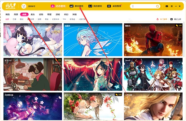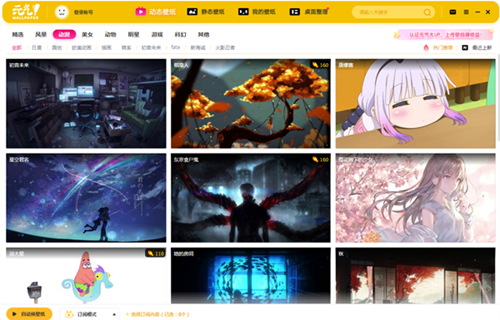 大分类为:动态壁纸,静态壁纸;小分类为:精选、风景、动漫、美女、动物、明星、游戏、科幻和其他等,