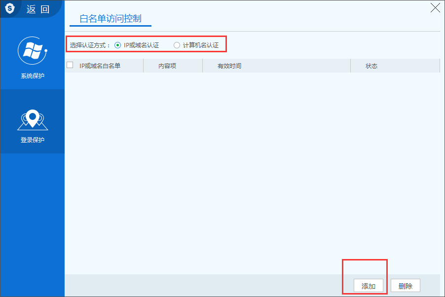 3、然后在点击登录保护后的设置选项,打开白名单访问控制界面,您需要选择认证的方式“IP域名认证”或“计算机名认证”,选择完成后,点击右下角的【添加】按钮。