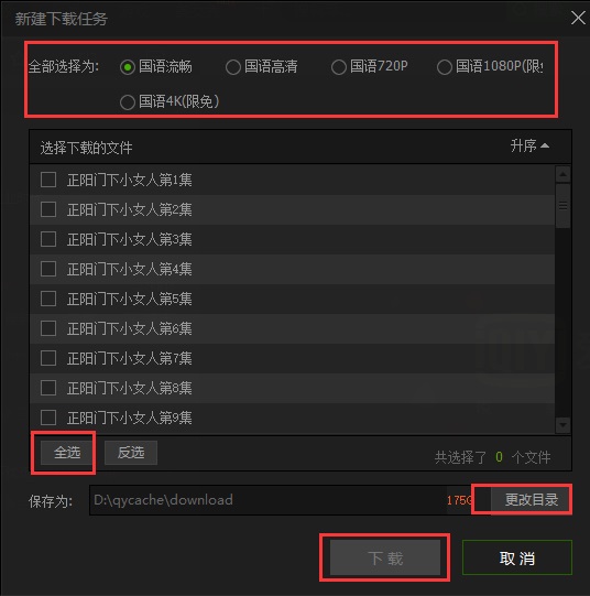 如下图所示,设置下载的语言、视频质量、下载的剧集以及下载保存的目录。